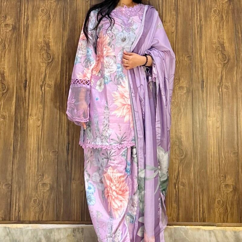 Light lavender pure chiffon Nyra cut suit . Light print and delicately embroidered suit will steal away your heart . Pure chiffon Georgette mix duppatta beautifully laced gives a soothing blow to the skin. You will love it being spotted by all in the varied occasions.