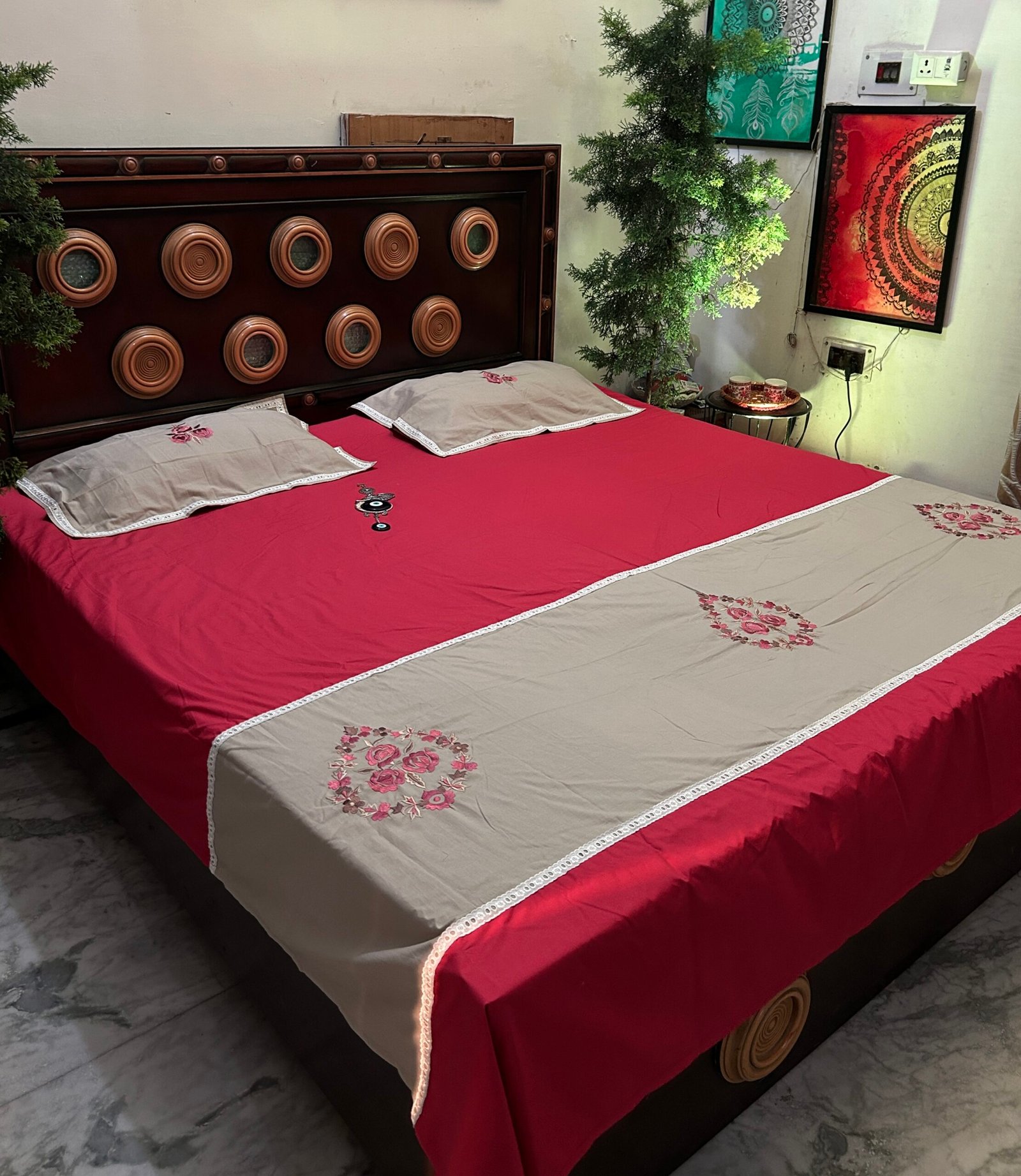 The bold red base is beautifully complemented by soft beige panels adorned with delicate floral embroidery, bringing a perfect balance of vibrance and grace to your space. The matching pillow covers, with lace-trimmed edges and embroidered rose motifs, complete the sophisticated look. Made from breathable, high-quality cotton, this bedsheet offers both style and comfort, making it ideal for festive occasions or everyday elegance.