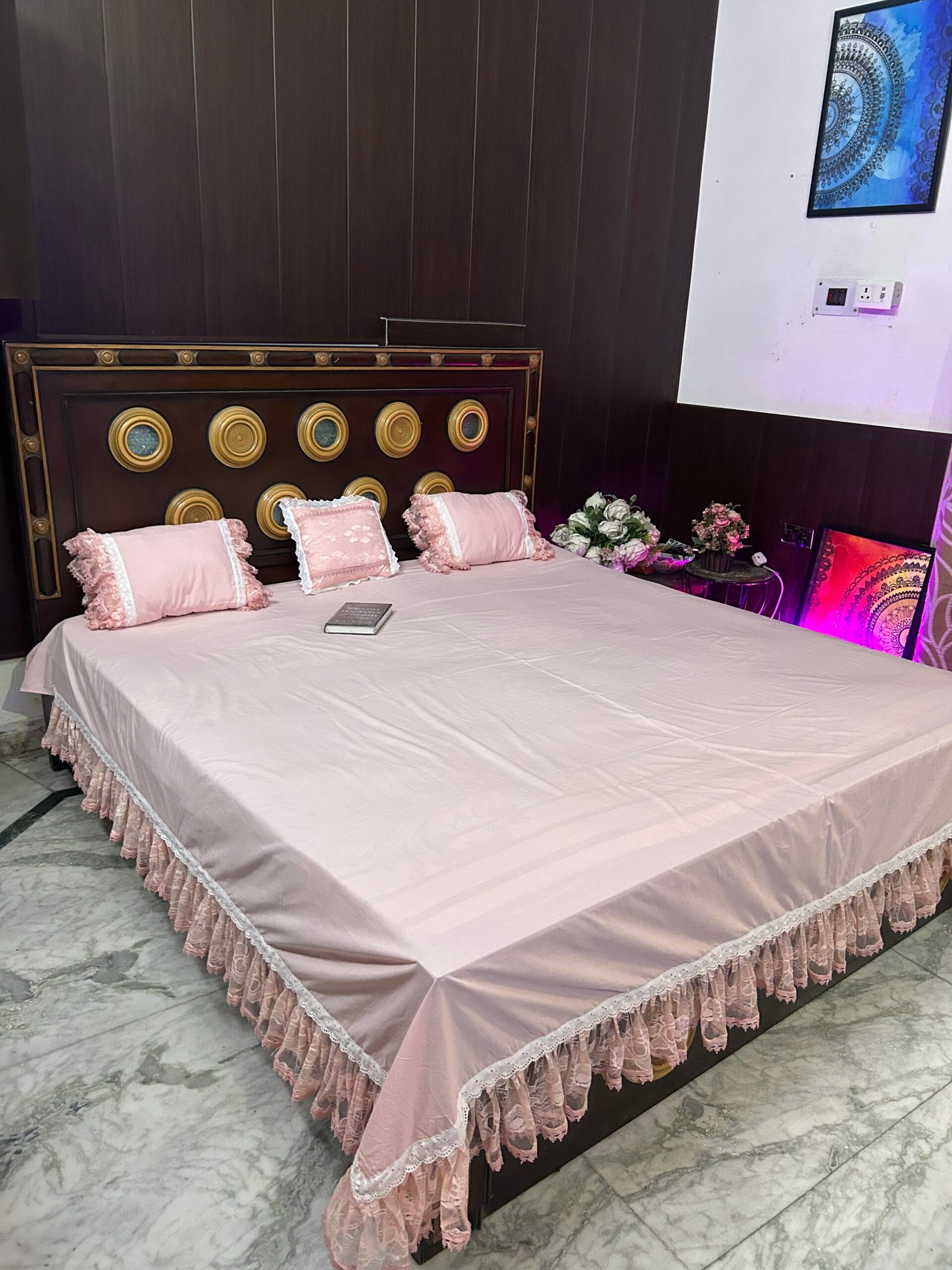 Add a touch of charm and sophistication to your bedroom with our soft pastel pink bedsheet set, designed with delicate lace detailing. Crafted from premium quality fabric, this bedsheet not only enhances the beauty of your space but also provides ultimate comfort for a restful sleep.