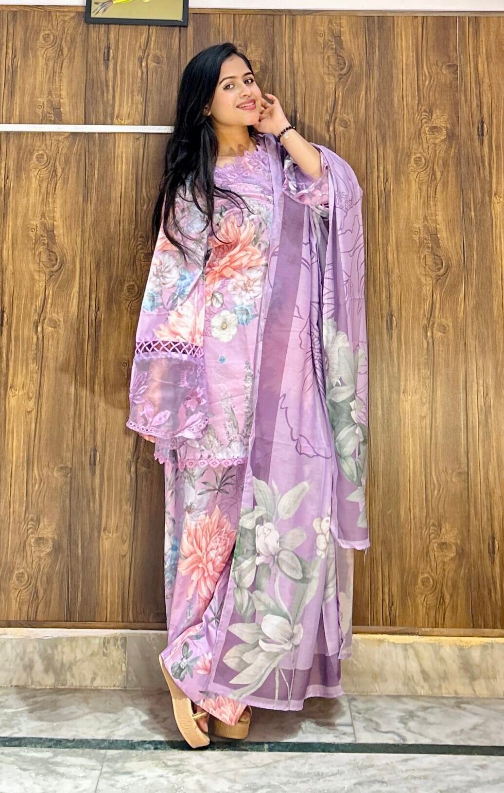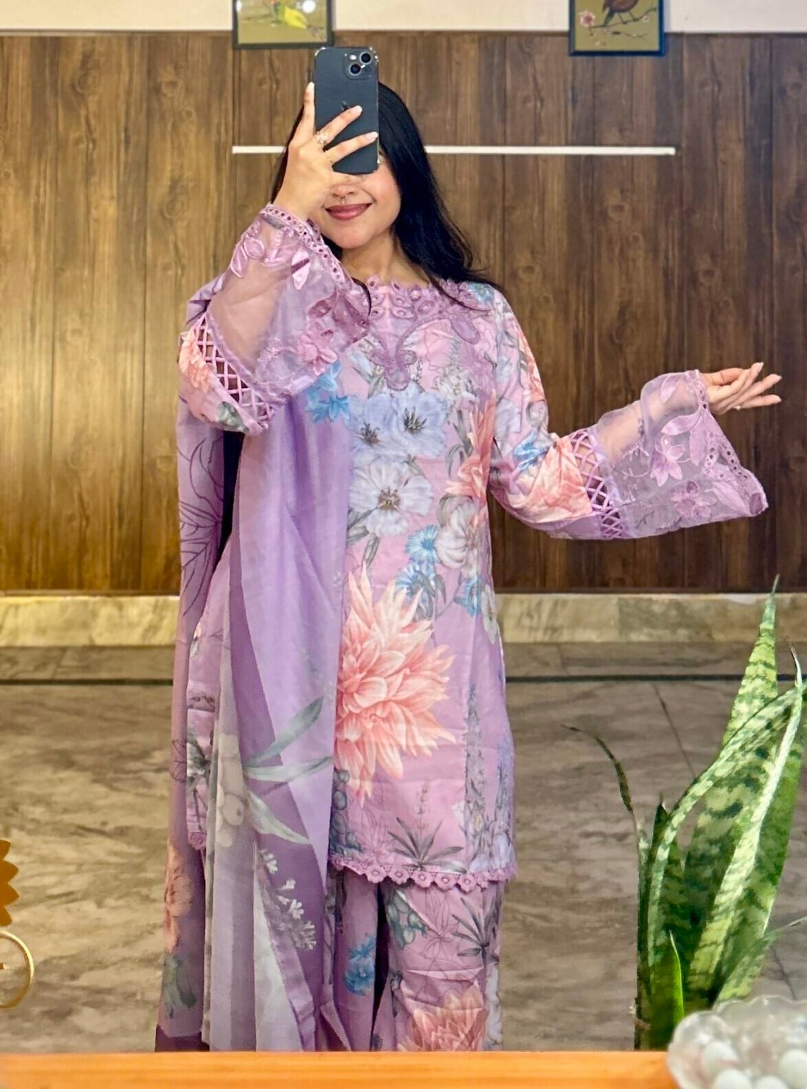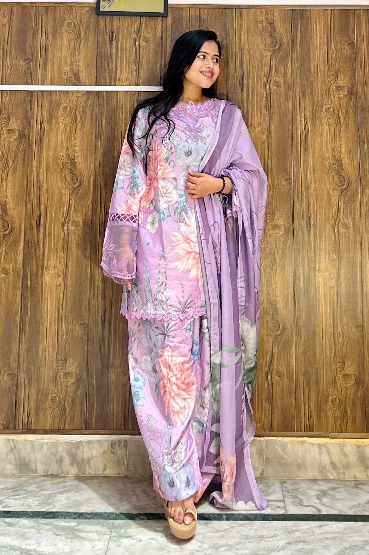 Elegant and effortlessly graceful, the Lilac Bloom Pakistani Suit Set is designed to bring a soft, feminine charm to your wardrobe. Crafted in a soothing lilac base with delicate floral prints, this outfit reflects the timeless beauty of classic Pakistani silhouettes.