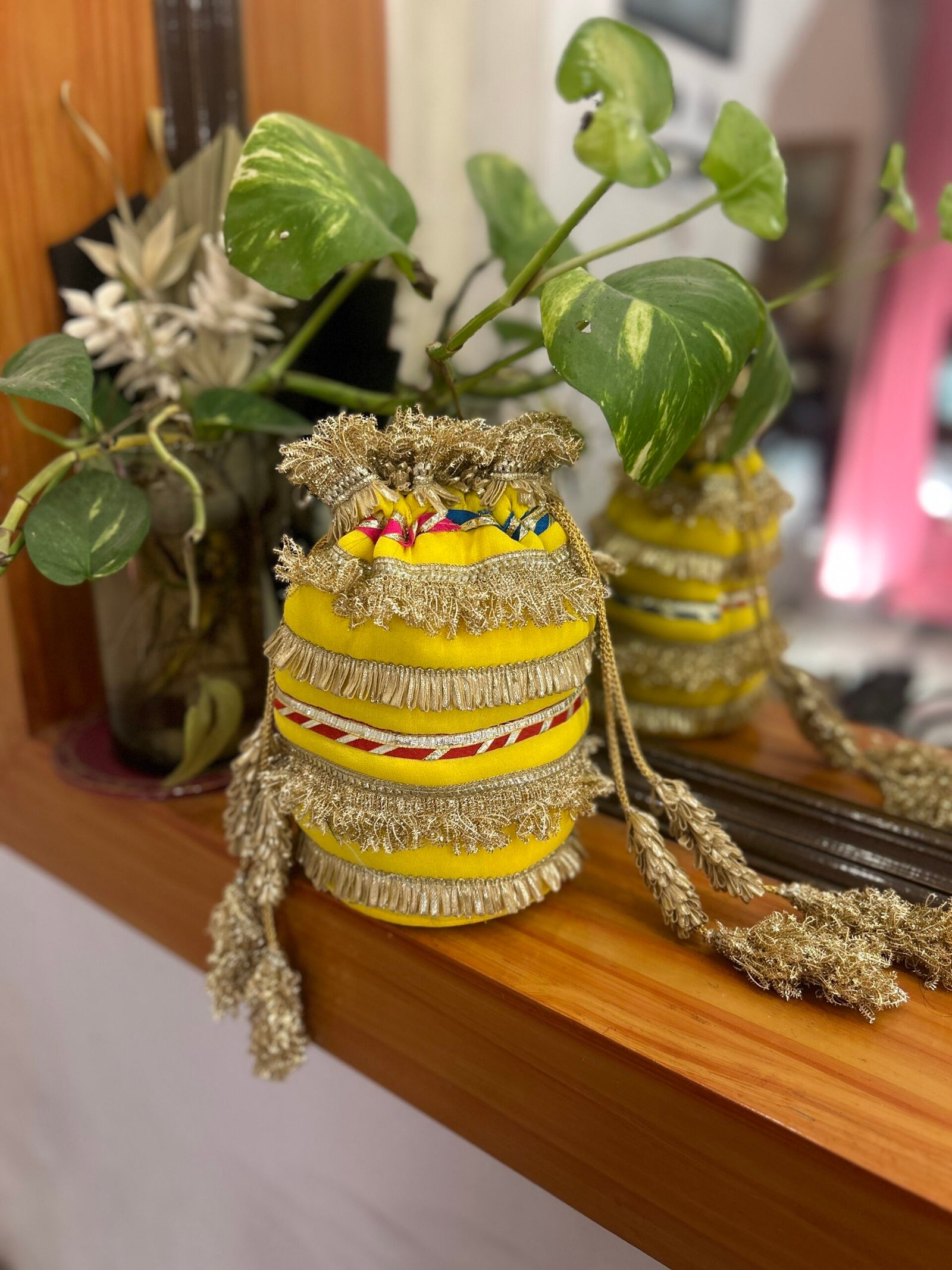 Bright, bold, and beautifully handcrafted — the Sunehri Tassel Potli is a celebration in itself. Designed in a striking sunshine yellow fabric, this potli is adorned with layered golden fringe detailing and delicate lace accents that add rich texture and movement.